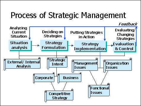 FIGURE: Strategic Management Process Figure above illustrates the dynamic, interrelated nature of the elements of the strategic management process and provides an outline of where the different elements of the process are covered in this text. Feedback linkages among the three primary elements indicate the dynamic nature of the strategic management process: Situation Analysis, Strategy Formulation and Strategy Implementation.