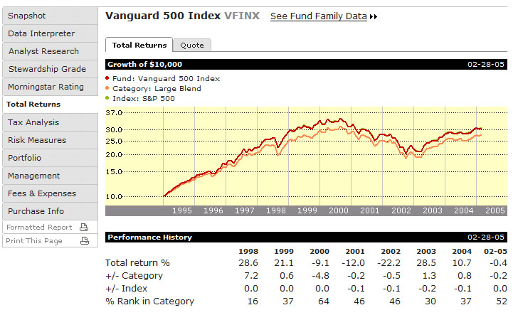 One of the easiest and most popular ways of comparing risk is to compare the return rates of investment funds that have similar investment objectives and similar risk characteristics. For example, all large-capitalization “blend” mutual funds are grouped in the same category, small-capitalization “growth” mutual funds are grouped in another category, and all international stocks are grouped in a third category. The average return on each fund within a specific category is calculated, and each fund is given a percentile ranking depending on its relative performance within the category and within the same time period. Generally, the lower the percentile ranking (the range is between one and one hundred), the better the performance. If your fund’s percentile ranking is sixteen, that fund is in the top 16 percent of all mutual funds within its category. To see an example of a mutual fund and its relative ranking, see Chart 26.1. Chart 26.1 shows a screen shot from www.Morningstar.com. The chart shows the fund’s total return, the fund’s return less the category average, and the return less the index return. The “percent rank in category,” shows the fund’s percentile ranking for each year that the fund has reported its performance to mutual fund reporting companies.