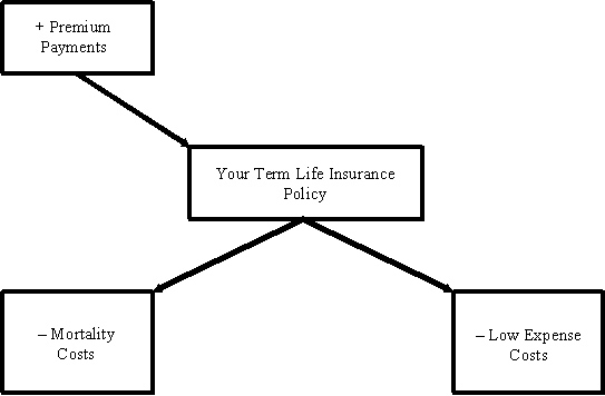 Figure 4 shows an example of a term policy. Premium payments are made on the term life insurance policy. These premium payments cover mortality costs and other fees. There is no buildup of cash—all premiums go to pay the costs and fees. As long as you continue making payments, you are covered for the contracted amount of time.