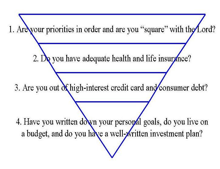 If you can answer "yes" to each of the statements from the top of the investment hourglass and can answer them affirmatively, you are ready to invest. This hourglass can help you keep your priorities in order: Heavenly Father first, family second, and personal responsibility third.