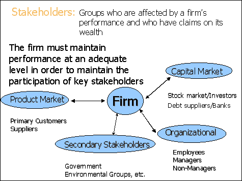 FREE online courses on Introduction to Strategic Management - Stakeholders in the Process - Stakeholders in the Process Stakeholders are the individuals and groups who can affect and are affected by the strategic outcomes achieved and who have enforceable claims on a company's performance. The stakeholder concept reflects that individuals and groups have a "stake" in the strategic outcomes of the company because they can be either positively or negatively affected by those outcomes and because achieving the strategic outcomes may be dependent upon the support or active participation of certain stakeholder groups.