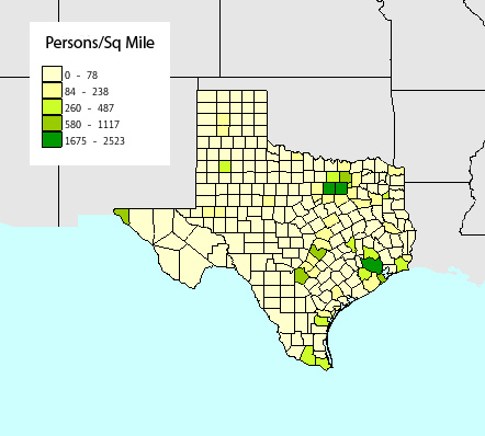 Figure 4.6.8, Texas' population. (“Persons per Square Mile,” U.S. Census Bureau, 2000. http://www.nationalatlas.gov/natlas/Natlasstart.asp)