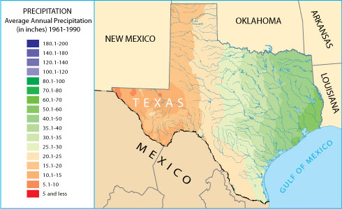 Figure 4.6.9, Texas' precipitation. (“Texas Precipitation Map,” National Atlas of the United States, 2005. http://nationalatlas.gov/printable/precipitation.html#list)
