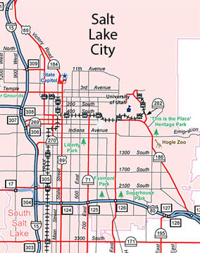 Figure 2.2.1 shows major freeways, but it does not include most other roads. You could use it to chart your course from Salt Lake City to St. George. It includes some of the larger towns along the way, which makes it possible for you to determine where you want to stop for gas, but there is not enough detail to help you find your way around Salt Lake City or any of the other communities. Some road maps are more detailed and cover smaller geographical areas. Figure 2.2.2 shows the main roads in Salt Lake City. Find Salt Lake City in Figure 2.2.1. Notice how both maps show the main interstate, I-15, but Figure 2.2.2 also shows the roads in Salt Lake that connect to I-15.