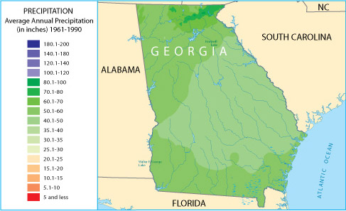 If your doctor recommended that you live in an area that is very dry, which of the two states would you chose? What if you wanted to farm but you did not want to have to irrigate (water) the crops? Which state would you chose? As you can see, a precipitation map provides much of the information we would need to make these judgments. With access to weather maps, it is not necessary for you to visit Colorado or Georgia in order to get a pretty good idea of which areas would be better for some things than others.