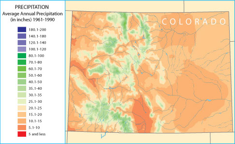 Weather mapsWeather maps show a variety of conditions. For example, some portray the amount of precipitation an area receives. Others show the average minimum and maximum temperatures. Figure 2.2.8 shows the average annual precipitation for the state of Georgia. Figure 2.2.9 shows the average annual precipitation for Colorado. Compare the two maps. Do you see that most of Georgia is much wetter than Colorado? However, notice that certain areas of Colorado receive as much rain as Georgia.