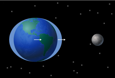 Figure 3.2.1, The gravitational pull of the moon creates tidal bulges on either side of the earth.