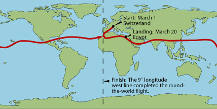 “The team lifted off from the snowy Swiss Alps on March 1, traveled south over the North African terrain, caught the jet stream east toward the Arabian Desert, India, and over Southeast Asia. The Pacific Ocean, which has been treacherous to previous balloon attempts, was smooth, and its crossing was accomplished in six days. Catching the jet stream, they were propelled across the Atlantic on their last leg…The journey was arduous and the duo experienced winds as slow as 20 miles per hour…to speeds of 100 mph in the jet streams.” 1 Footnotes