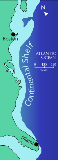 Continental shelves along the coasts of the United States cover an
