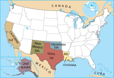 Figure 7.3.4, Top petroleum-producing states. (EIA, 2005. http://www.eia.doe.gov/kids/energyfacts/sources/non-renewable/oil.html)
