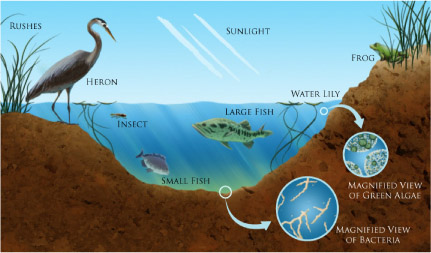 Many ecosystems have an interrelationship between land and bodies of water. A great example of a small ecosystem is a pond community. As is the case with all ecosystems, sunlight is the community's primary source of energy. The sunlight is the beginning of the ecosystem's food chain. The solar energy is captured and used as a food source by plants in a process called photosynthesis. The plants in this case are algae, rushes, and water lilies. The growing plants are then used as a food source by the animal life. For instance, the insects use the pollen from the plants, and the small fish eat algae and other aquatic plants. The insects and small fish are then used as food sources by larger creatures such as frogs or larger fish. The larger fish and frogs are then eaten by even larger animals such as the heron. Lastly, bacteria feed off the waste from animals or decaying plants; the bacteria breaks down these materials, which then creates and adds nutrients to the soil. The plants then draw the nutrients from the soil. The interdependence is not limited to food sources. For example, the plants rely on insects for pollination and the animals use the plants to build nests and homes. Plant seeds are spread and fertilized by animal waste. As you can see, the plants and animals are critical to one another's existence.