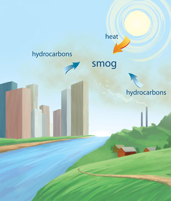 How it hurts youWhen ozone accumulates, it hurts people, pets, and crops. Normally, ozone converts back to oxygen. However, airborne hydrocarbons (from motor vehicles, industrial emissions, and other kinds of incomplete combustion and solvent use) can disrupt this conversion, allowing the ozone to accumulate. Because sunlight and heat play roles in the creation of smog, ozone concentrations most often rise in the warmer months of the year and peak during the warmer hours of the day. While winds might dissipate the ozone, frequent temperature inversions during warm weather can hold down and stagnate the lower atmosphere, allowing ozone to build up. Sometimes inversions occur. Normally, warm air rises until it cools at higher altitudes, thus moving and mixing the air. A temperature inversion occurs when the upper air is warmer and prevents the lower air from rising, trapping it in place. This frequently happens during the winter months in cities that are situated in mountain valleys. This happens in many cities, which is where the term “urban smog” comes from. The buildup of ozone causes the grey, thick, photochemical smog that is often present in large, metropolitan areas.